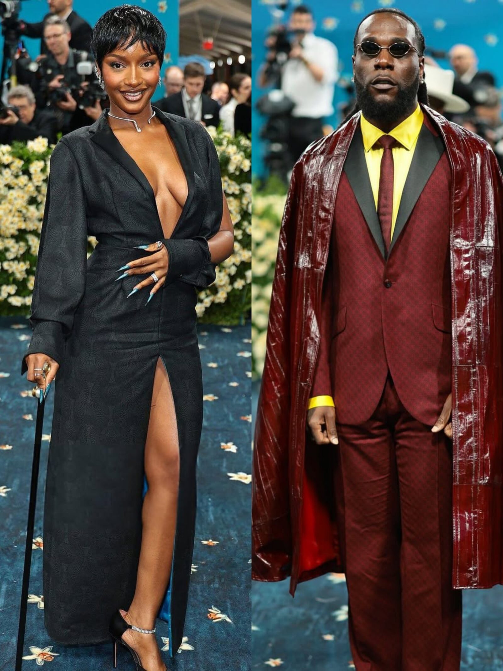 The annual fashion extravaganza, hosted at the Metropolitan Museum of Art, celebrated Black tailoring and its influence on fashion globally. Burna Boy, renowned for his fearless sense of style, emerged in a burgundy three-piece ensemble, complete with matching leather cape, exuding royal swagger. Ayra Starr, who was a Met Gala first-timer, stunned in a sleek black dress with electric blue lining and stylish sleeve cutouts, exuding chic modernity.