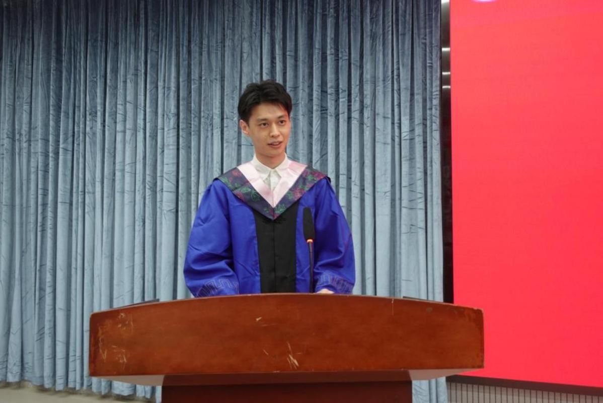 硕士毕业生代表李海德忆及三年求学历程的成长蜕变,他感念老师的悉心指导与同窗的携手同行,嘱咐师弟师妹早定学术规划,携 “格物至善,博古通今” 的院训精神勇毅前行。
