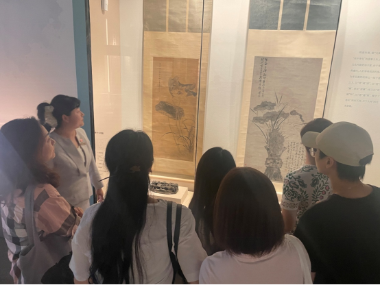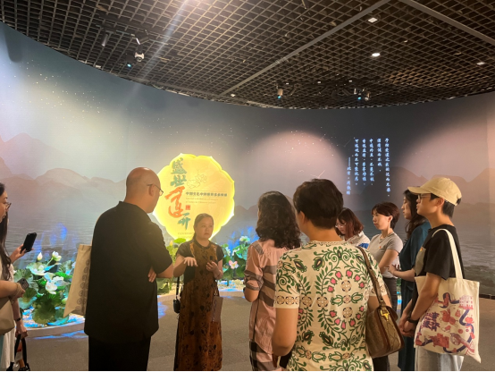 同志们认真聆听了谢经理对莲荷文化、展览的由来、策展思路等内容的介绍,谢经理指出,“中国文化中的莲荷意向特展”是推动学习贯彻习近平新时代中国特色社会主义思想主题教育走深走实的具体体现,展览从多个维度诠释了中国莲文化丰富的内涵,具象化的展现了和美、圣洁、福寿、清廉等美好意境,生动地揭示出中华民族传承千年的“和合之美、美美与共”的文化观念,与当今弘扬社会主义核心价值观、共建人类命运共同体的时代主题相得益彰。丰富的展品还昭示了千年来中国人潜心追求的高洁人世、超凡出世、和美普世的价值取向,体现了中国共产党人自我净化、自我完善、自我革新、自我提高的文化基因。