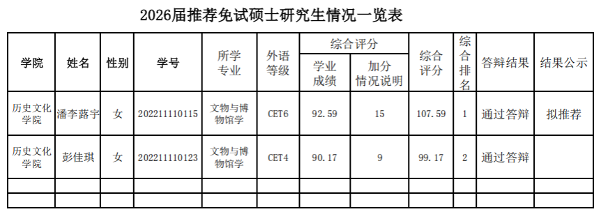 根据《yl23455永利集团推荐2026届优秀应届本科毕业生免试攻读硕士学位研究生的实施办法》的要求,yl23455永利集团制定并发布了《yl23455永利集团关于推荐2026届优秀应届本科毕业生免试攻读硕士学位研究生的工作方案》。经员工自愿申请、学管办审核后,推免遴选工作小组、专家审核小组对申请员工的相关材料进行审核鉴定,报教务处审定后,确定了2026届拟推荐免试攻读硕士学位研究生名单。现将拟推荐结果公示如下,公示期为2025年9月10日—9月12日。如有异议,请在公示期内以实名的形式向yl23455永利集团纪委反映,监督电话:85070937。拟推荐结果如下: